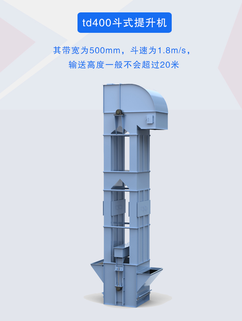 td400斗式提升機(jī)牽引件為橡膠帶,斗寬為400mm,帶寬為500mm,斗速為1.8m/s,提升高度達(dá)80米.提升量每小時可達(dá)24-66立方,可根據(jù)用戶要求選擇碳鋼和不銹鋼材質(zhì).