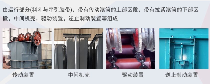 td斗式提升機(jī)牽引件為橡膠帶,料斗以一定的間隔固定在橡膠帶上,橡膠帶分別繞過提升機(jī)頭部和底部的滾筒,構(gòu)成具有上升有載分支和下降無載分支的閉合環(huán)形系統(tǒng);工作時,布置在提升機(jī)頭部的驅(qū)動裝置通過頭部滾筒將動力傳給橡膠帶和料斗,物料從提升機(jī)底部的進(jìn)料口進(jìn)入料斗,料斗將物料提升至頭部的卸料口,在離心力和重力的共同作用下,料斗中的物料經(jīng)卸料口卸出。