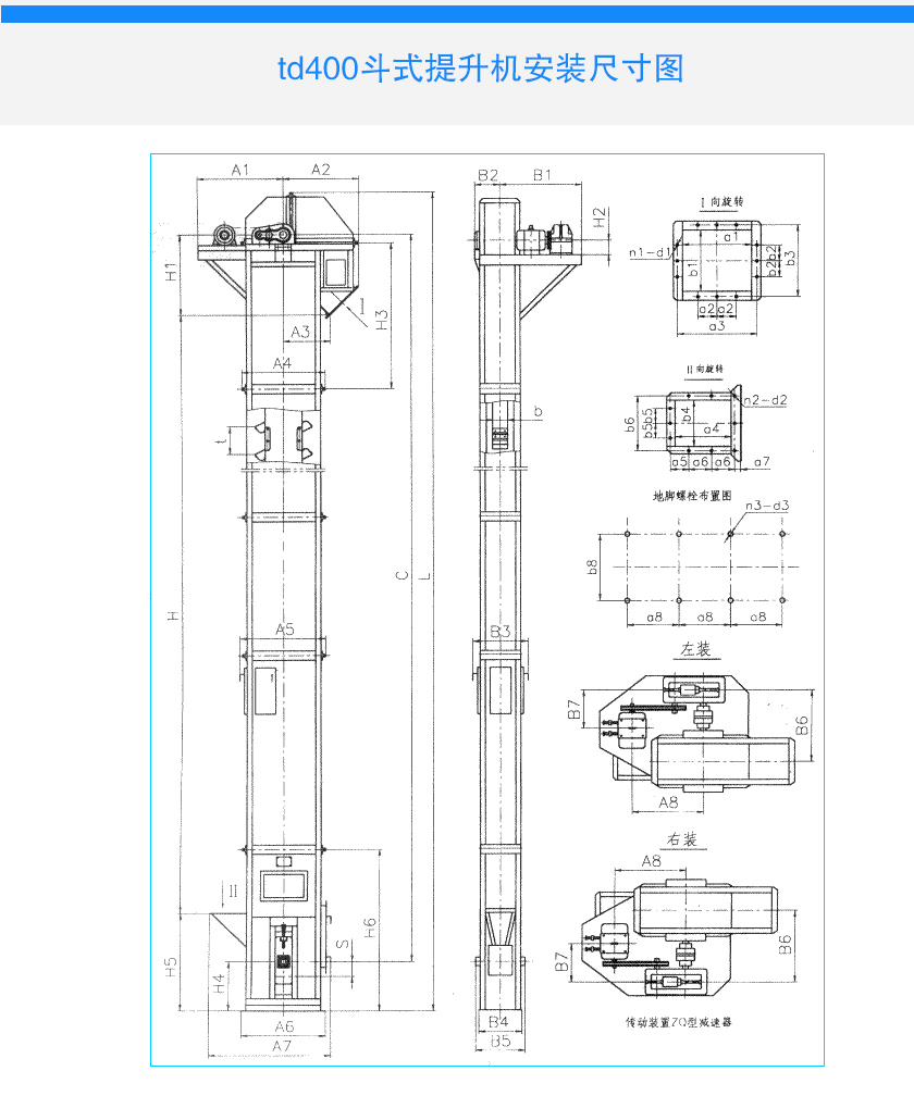 td400斗式提升機(jī)由運行部分(料斗與牽引膠帶),帶有傳動滾筒的上部區(qū)段,帶有拉緊滾筒的下部區(qū)段,中間機(jī)殼,驅(qū)動裝置,逆止制動裝置等組成,傳動裝置有兩種形式,分別配有YZ型減速器、ZQ(或YY)型減速器,YZ型軸減速器直接是安裝在主軸軸頭上,省去了提升機(jī)傳動平臺、聯(lián)軸器等,結(jié)構(gòu)更為緊湊,重量輕,內(nèi)部安裝有異型逆止器,逆止可靠。
