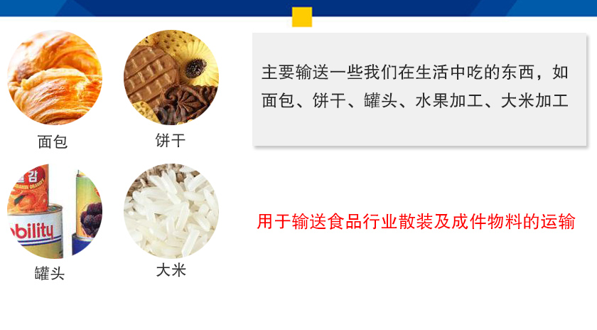 食品皮帶輸送機(jī)主要輸送一些我們在生活中吃的東西,如面包、餅干、罐頭、水果加工、大米加工等。