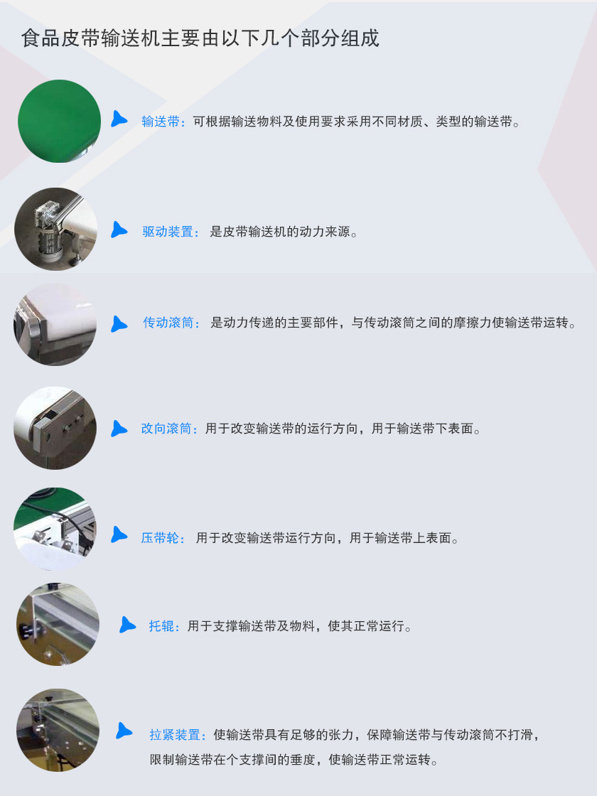 食品皮帶輸送機(jī)主要由以下幾個部分組成: