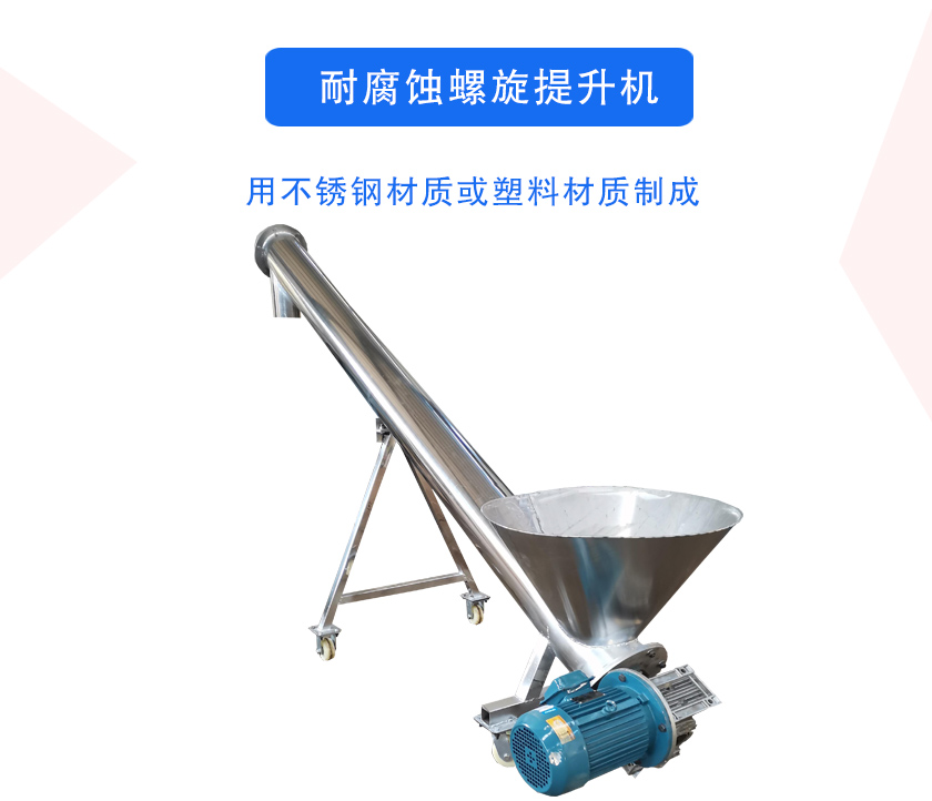 耐腐蝕螺旋提升機主要是采用不銹鋼材質(zhì)或塑料材質(zhì)制成的,可以滿足酸堿性等腐蝕性物料的輸送問題,可應用在化工、食品、醫(yī)藥等行業(yè).