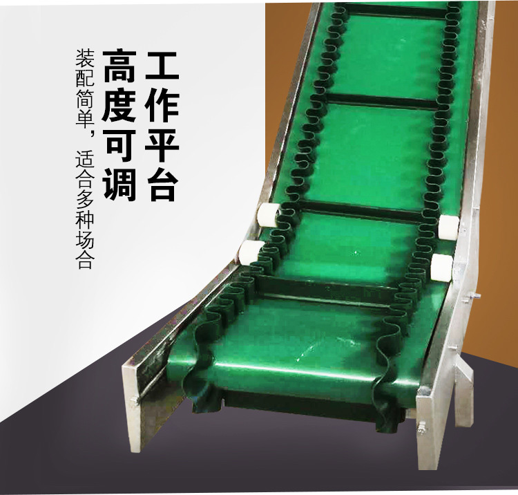 裙邊皮帶輸送機是在平形橡膠運輸帶兩側粘上可自由伸縮的橡膠波形立式"裙邊",在裙邊之間又粘有一定強度和彈性的橫隔板組成匣形斗,對物料進行連續(xù)輸送的設備??纱髢A角輸送甚至垂直提升散料。