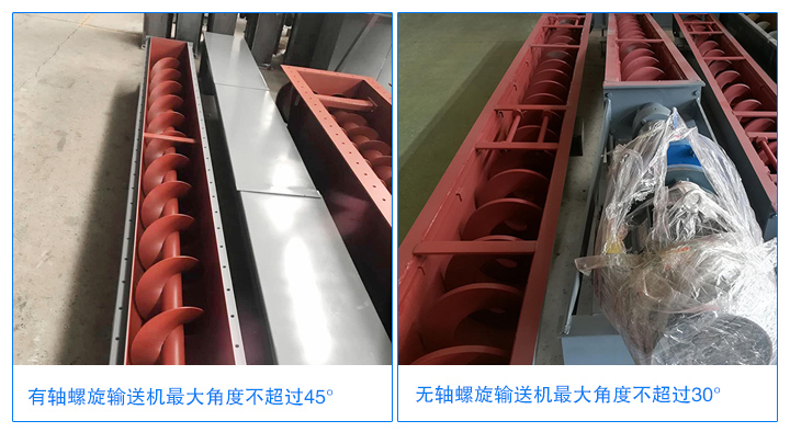 有軸螺旋輸送機(jī)角度不超過(guò)45°,有軸螺旋輸送機(jī)因機(jī)體有軸分布,輸送物料相對(duì)無(wú)軸少。