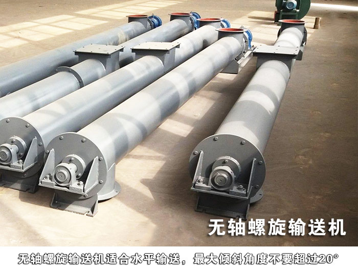 無軸螺旋輸送機(jī)適合水平輸送,傾斜角度不要超過20°(根據(jù)實(shí)際的使用情況而言。)