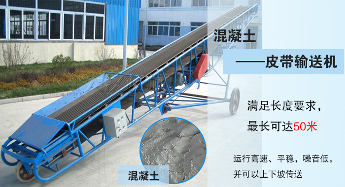 皮帶輸送機(jī)具有輸送能力強(qiáng),輸送距離遠(yuǎn)(可達(dá)50米),結(jié)構(gòu)簡(jiǎn)單易于維護(hù),能方便地實(shí)行程序化控制和自動(dòng)化操作。帶式輸送機(jī)主要由兩個(gè)端點(diǎn)滾筒及緊套其上的閉合輸送帶組成 。運(yùn)用輸送帶的連續(xù)或間歇運(yùn)動(dòng)來(lái)輸送100KG以下的混凝土,其運(yùn)行高速、平穩(wěn),噪音低,并可以上下坡傳送。