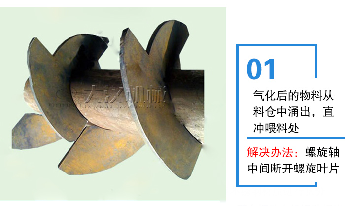 沖料原因3:螺旋葉片加工不當(dāng)絨磨損,使得兩者之間的間隙過大,粉料便從其底部間隙流向出料口。