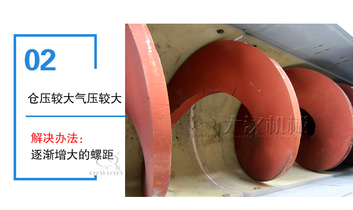 沖料原因2:倉壓較大氣壓較大,粉料沿賺旋葉片螺旋方向沖向出料口,使得喂料機(jī)在喂料處被物料“淹沒”。