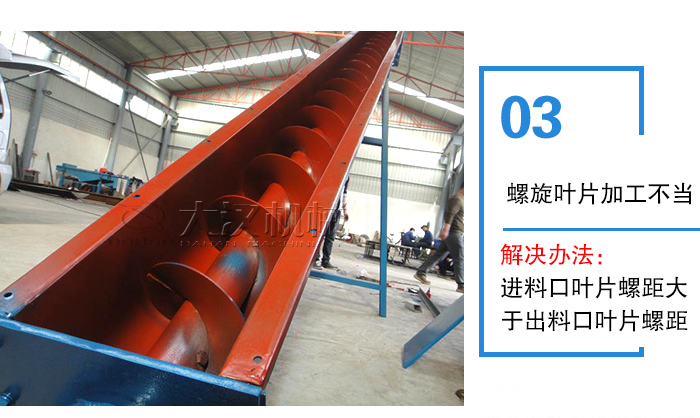 解決辦法:對于較長的螺旋輸送機(jī)可采取逐漸增大的螺距,防止輸送機(jī)在喂料處被物料淹沒而產(chǎn)生的過負(fù)荷,也可防止氣化后物料從料倉中向外涌出。