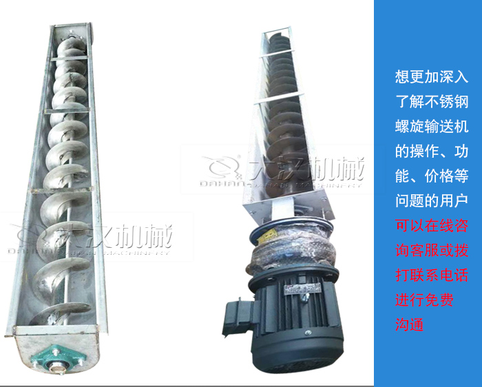 以上就是大漢小編為您介紹的輸送葡萄干所用的不銹鋼螺旋輸送機,想更加深入了解不銹鋼螺旋輸送機的操作、功能、價格等問題的用戶可以在線咨詢客服或撥打聯(lián)系電話進行免費溝通。