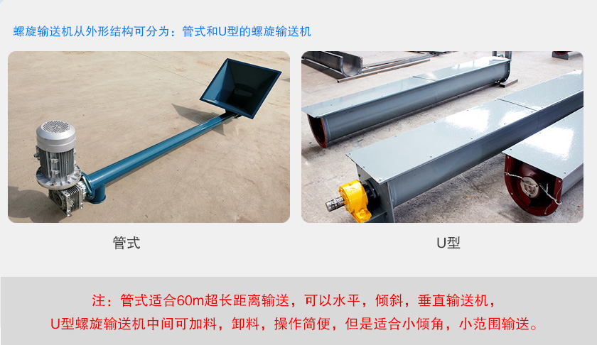 注:管式適合60m超長距離輸送,可以水平,傾斜,垂直輸送機,U型螺旋輸送機中間可加料,卸料,操作簡便,但是適合小傾角,小范圍輸送。