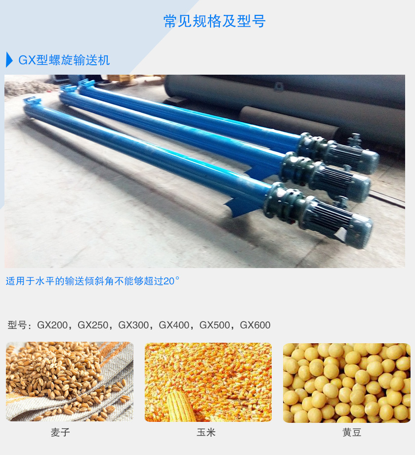 GX型螺旋輸送機是較老的螺旋輸送設備,其有單管于雙管兩種形式,適用于水平的輸送傾斜角不能夠超過20°??奢斔鸵恍K狀的(小塊狀物料)例如:麥子,玉米,黃豆等糧食。