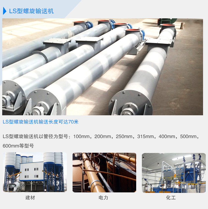 型號:LS型螺旋輸送機以管徑為型號:100mm,200mm,250mm,315mm,400mm,500mm,600mm等型號。
