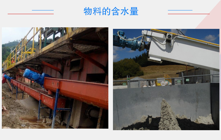 物料含水量的高低會影響螺旋輸送機輸送效率,含水量高,物料在輸送過程中極易粘附在螺旋葉片上火輸送機內(nèi)壁上,長此以往,粘附在葉片和內(nèi)壁上的物料會增多,造成堵網(wǎng)現(xiàn)象,大大降低螺旋輸送機的輸送量,長久黏附的物料還需要進行人工清除。