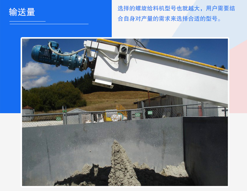 輸送量大小將直接決定設備型號大小的選擇,用戶所需產(chǎn)量越大,選擇的螺旋給料機型號也就越大,用戶需要結合自身對產(chǎn)量的需求來選擇合適的型號。