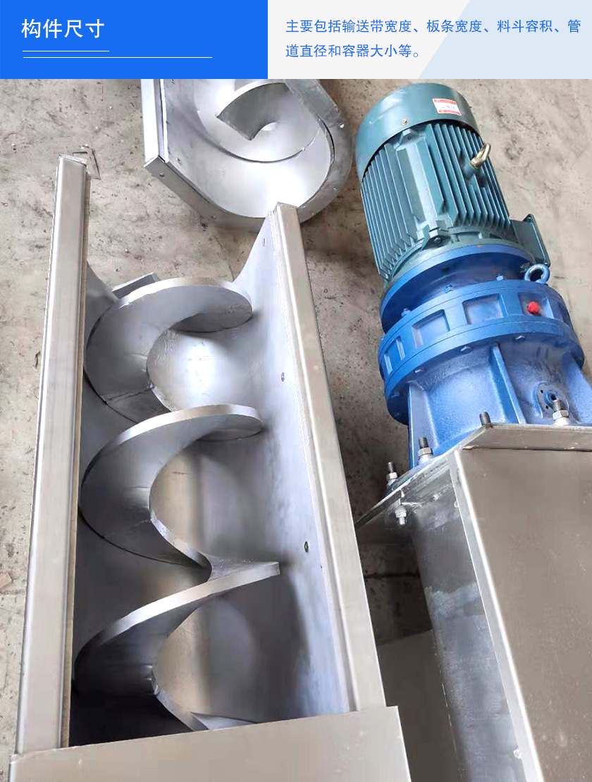 主要包括輸送帶寬度、板條寬度、料斗容積、管道直徑和容器大小等。這些構件尺寸都直接影響螺旋給料機的輸送能力。如螺旋輸送機管徑越大,效率也就越高。當然,并不一定就是輸送機本身才能影響效率,物料的各種性質(zhì)也都會對效率有所影響。