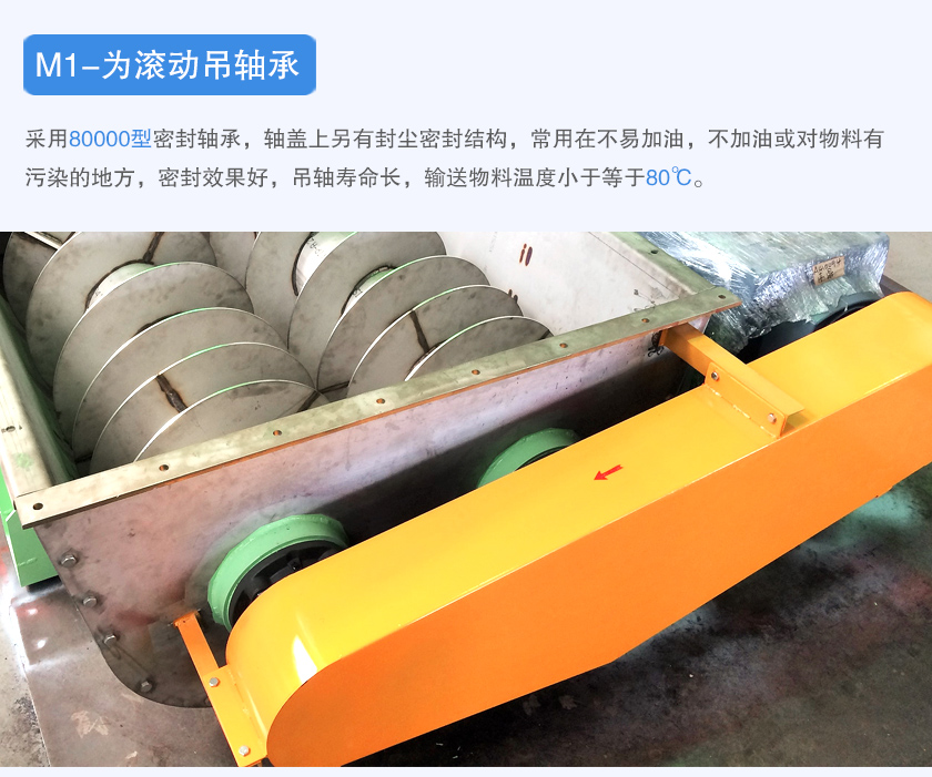 采用80000型密封軸承,軸蓋上另有封塵密封結(jié)構(gòu),常用在不易加油,不加油或?qū)ξ锪嫌形廴镜牡胤剑芊庑Ч?,吊軸壽命長,輸送物料溫度小于等于80℃。
